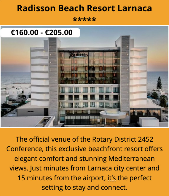 The Rotary District Conference will be held at the Radisson Beach Resort in Larnaca, Cyprus. ​